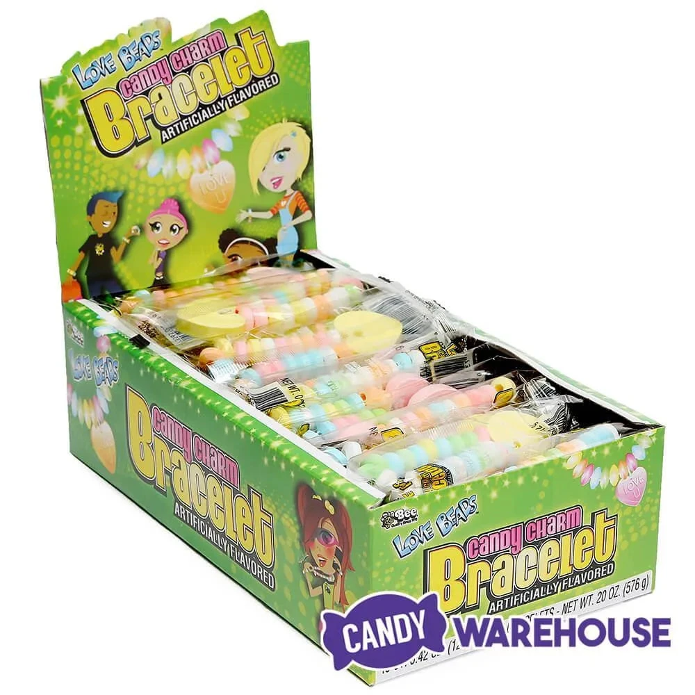 Candy bracelets with a heart-shaped medallion attached.
