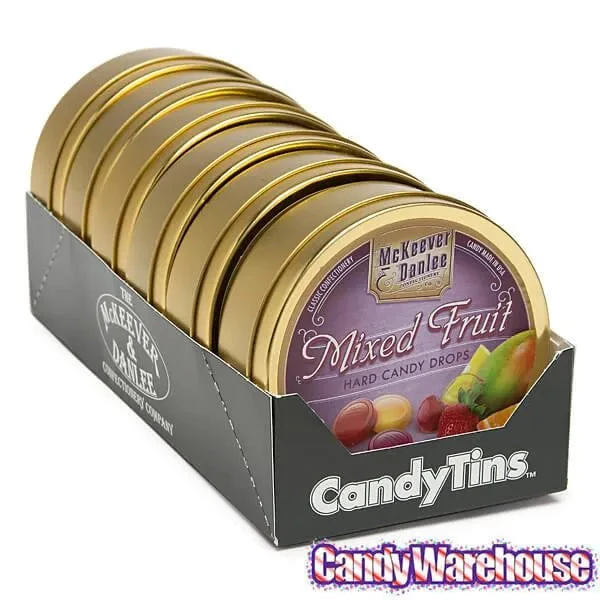 Display box contains 6 McKeever & Danlee Mixed Fruit Candy Bon Bons Tins, each with a net weight of 4.4 ounces.