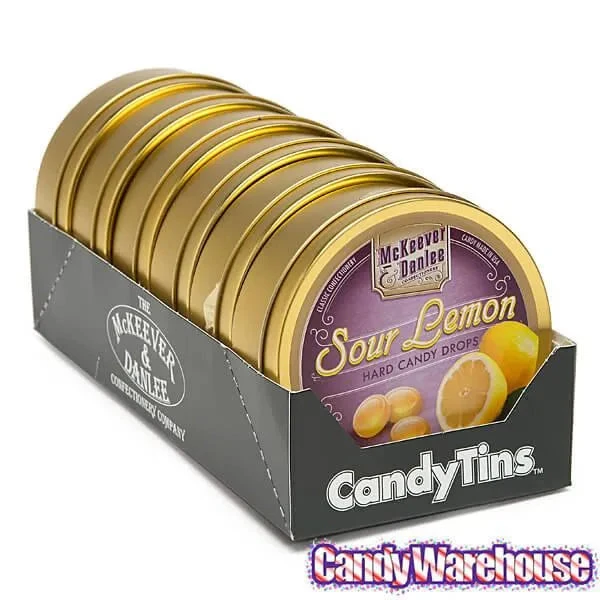 Display box contains 6 McKeever & Danlee Sour Lemon Candy Bon Bons Tins, each with a net weight of 4.4 ounces.