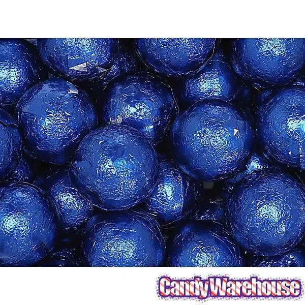 Bag contains 5 pounds of Royal Blue Foiled Caramel Filled Chocolate Candy Balls.