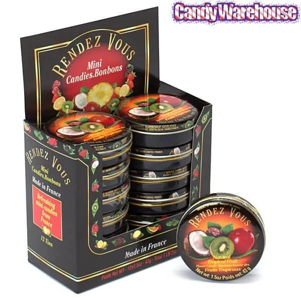 Display box contains 12 Rendez Vous Tropical Fruit Mini Bon Bons Candy Tins.
