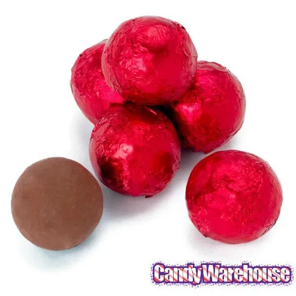 Bag contains 5 pounds of Red Foiled Milk Chocolate Balls Candy.