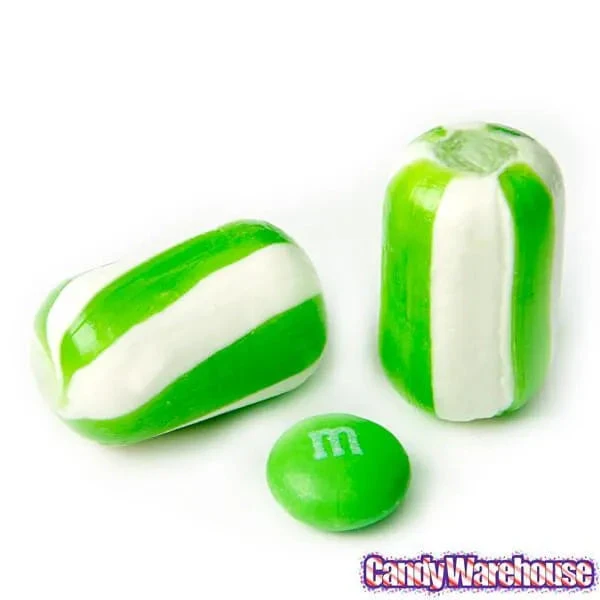 Bag contains 5 pounds of Green Sassy Cylinders Striped Candy.